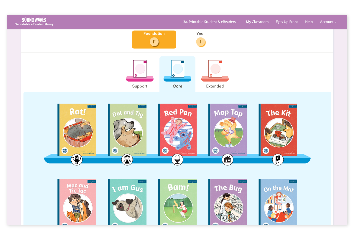 The Sound Waves Decodable eReader Library is our newest feature, providing students with access to our entire range of decodable readers. The eLibrary includes all Support, Core and Extended books from Foundation and Year 1 – that’s 266 books in total!